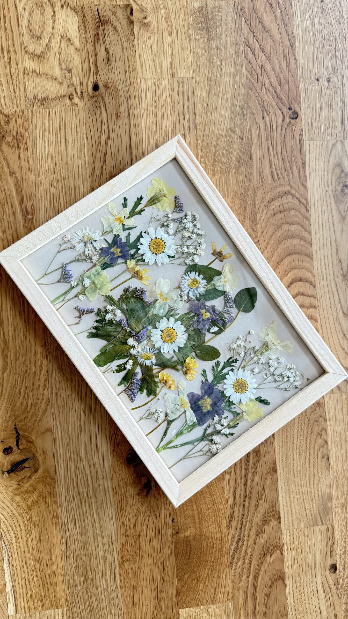 Aus einer grossen Auswahl an gepressten Blüten, Gräsern und Blättern entwickelst du Schritt für Schritt deine eigene Komposition.